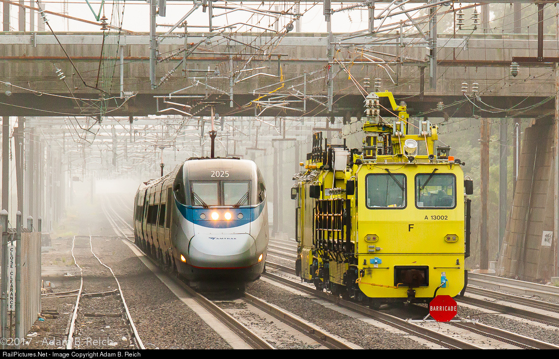 : Acela Express Train 2107 emerges from the fog and passes a Tesmec Constant Tension Catenary Stringing Unit parked just east of Princeton Junction Station on Wednesday, August 16, 2017.