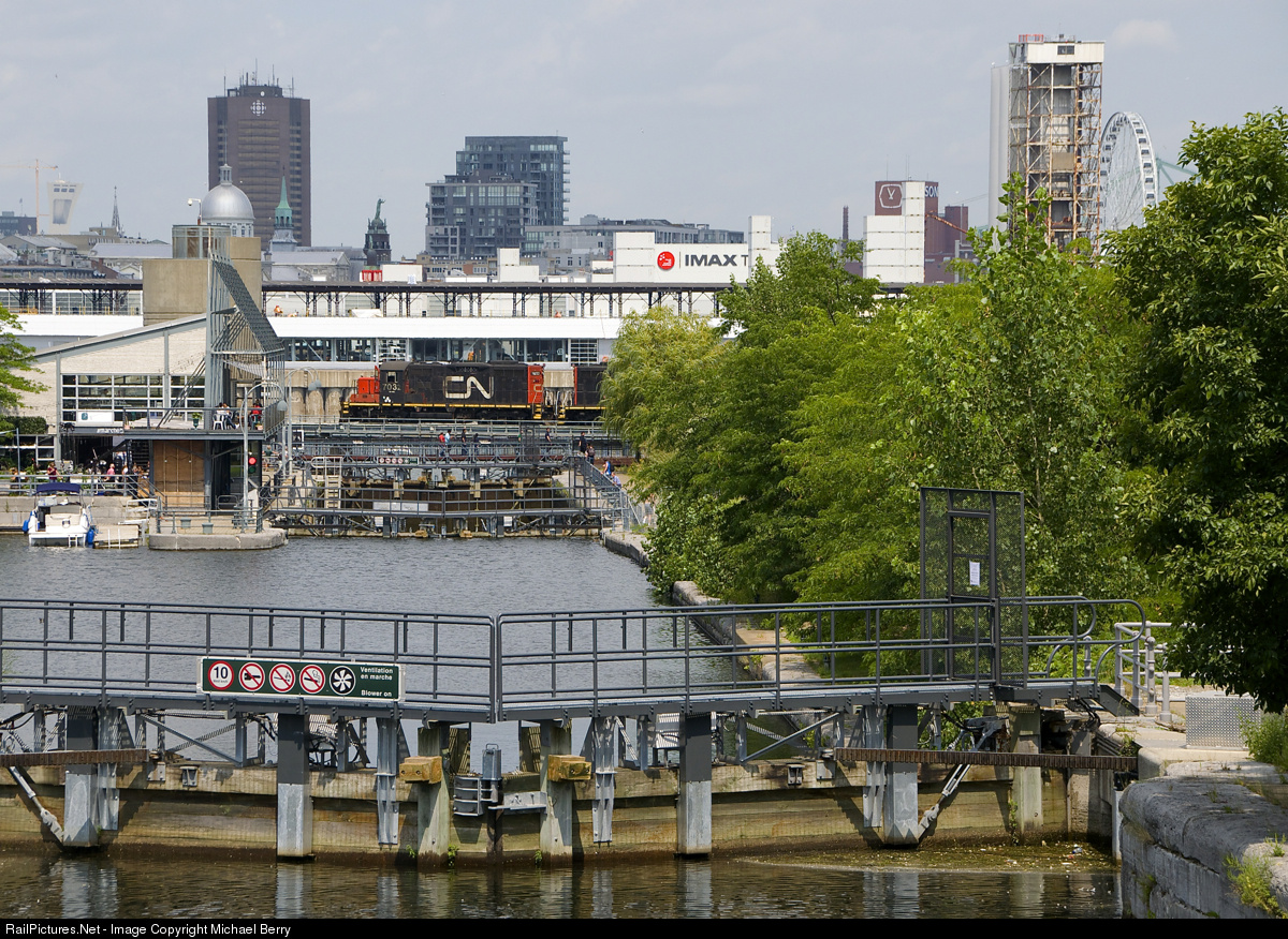 Stopped by the locks. CN 7032 is stopped over the eastern end of the Lachine Canal before backing up with a cut of grain cars. In the foreground are a set of locks, used by pleasure boats on the canal.
