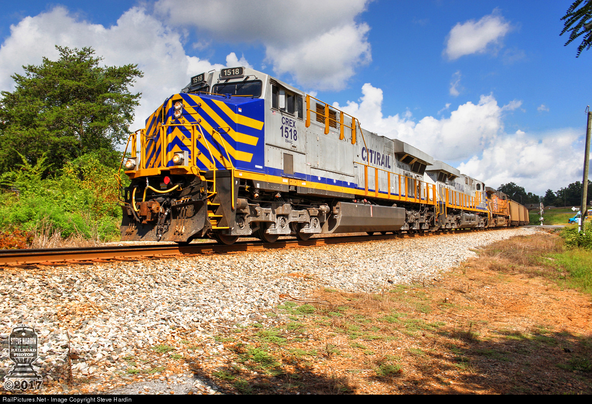 | A pair of CREX engines, along with a UP GE bring a loaded coal train Southbound on the Etowah Sub bound for the GA Power Plant in Stilesboro. |