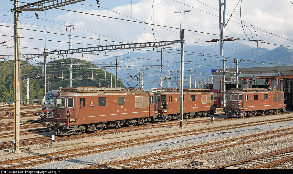 | Re 4/4 or Re 425 # 189, 181 and 171 of the BLS in front of the depot Spiez. |