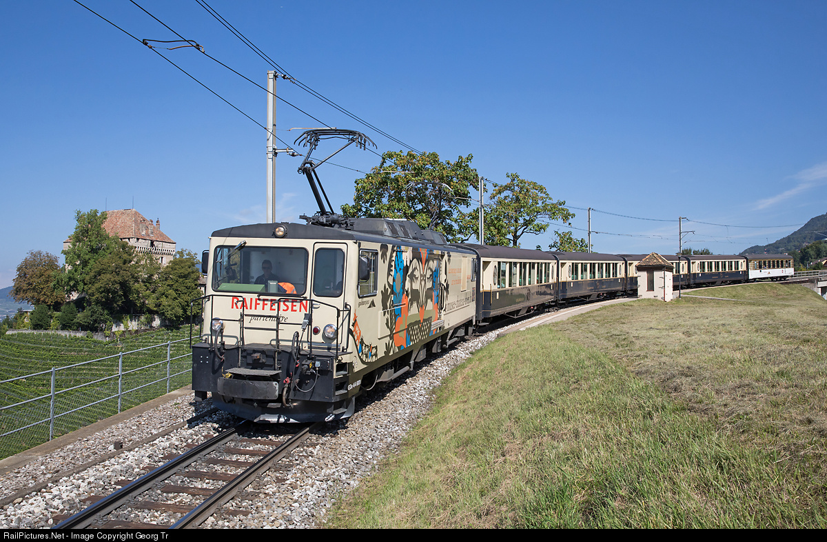 | Train 2213 of the MOB running through Châtelard stop above Montreux, with locomotive GDe 4/4 # 6001 in the "Raiffeisen/Musée du Château-d'Oex" and "Belle Epoque" cars. Because of a line interruption, the train was coming from Montbovon only, where it was turned from train 2216. |
