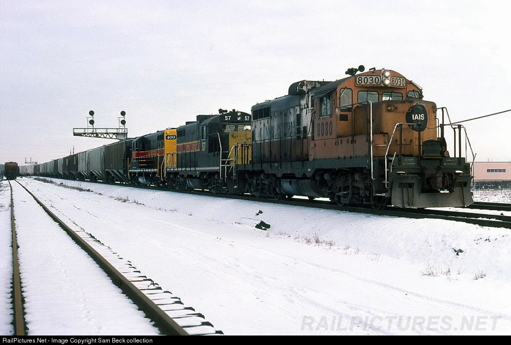 | Still wearing Illinois Central Gulf paint, IAIS 8030 leads a pair of Iowa Interstate-painted Geeps through Robbins. Tom Golden photo. |