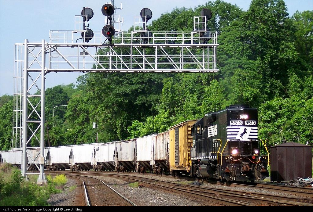 | Here comes another high-hood longhood forward running stint by Norfolk Southern... geep 38-2 5513 is in charge of 1 boxcar and 13 hoppers as it hauls the local out of S. Philly west to Abrams Yard. |