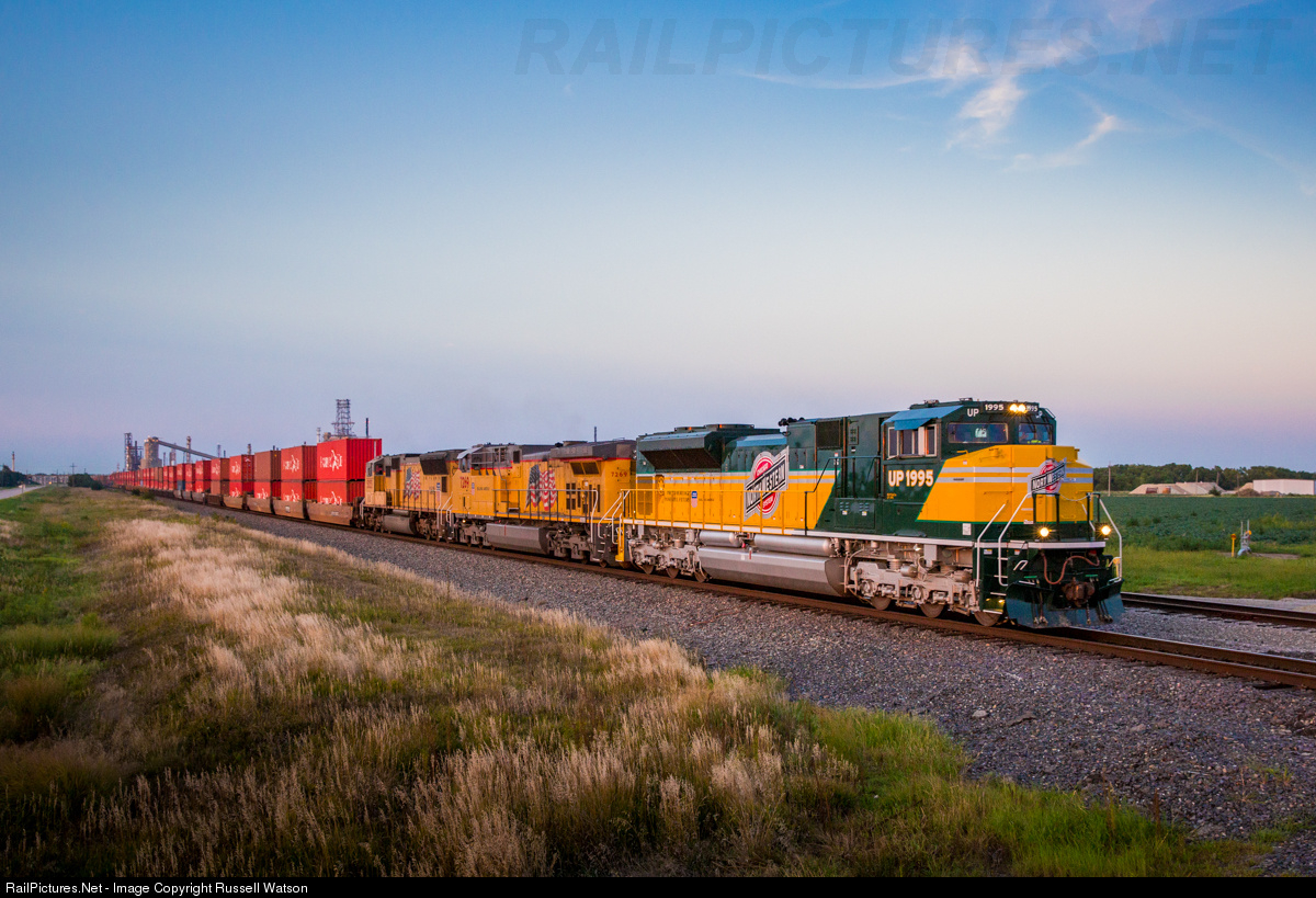 | As last light sets in, the KG4LB 18 led by the newly repainted UP 1995 will complete the rest of its journey through Kansas under the cover of darkness as it highballs McPherson on the UP Herington Sub. |