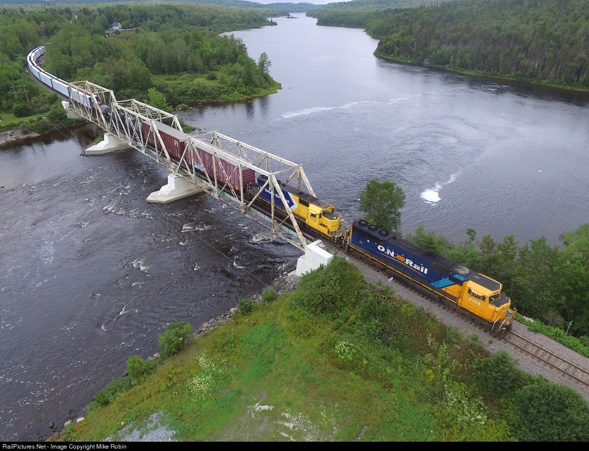 We are high above the rushing Montreal River at Latchford Ontario as southbound 214 crosses the bridge at mile 93 of the Temagami Subdivision August 19th. Big Thanks to Phil for assisting in capturing this shot