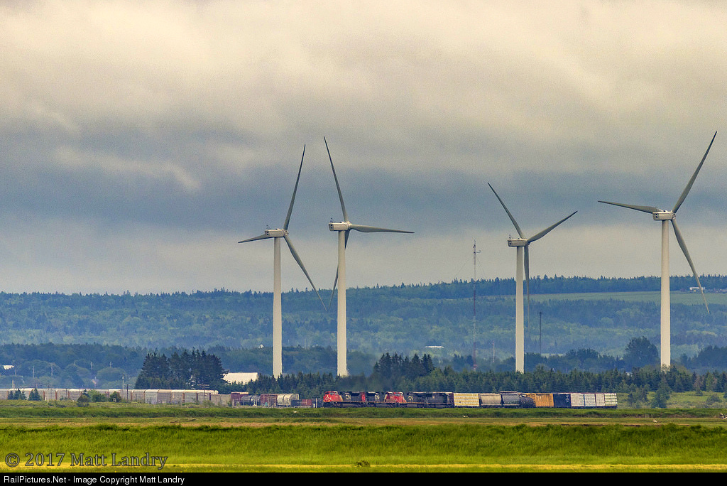 About 5 miles from my location, shot with my 150-600mm lens, westbound train 407 rounds the bend at Fort Beausejour, with the turbines in the background actually being located in Nova Scotia, as the train is crossing the provincial border.