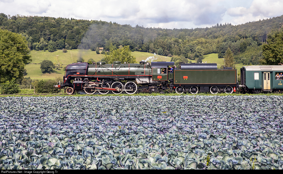 On the occasion of the "Badenfahrt", a large fair which is held every 10 years, the canadian built, former french railways SNCF, "Mikado" steamlocomotive 141 R # 1244, made round trips "round the Lägern", from Baden via Regensdorf-Zürich Seebach-Bülach-Eglisau-Koblenz-Turgi to Baden. The heavy fuel oil fired 2-8-2 is running along a large red cabbage field near Kaiserstuhl (AG).