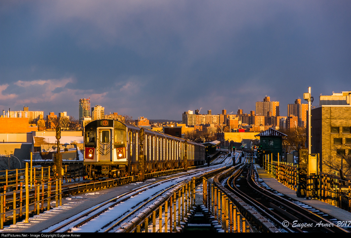 On a freezing Sunday afternoon in January, a dark sky and the buildings of Flushing provide the backdrop for a Manhattan-bound No.7 train approaching Junction Boulevard, minutes before sunset. The snow from the previous days storm lies undisturbed along the centre express track, but the Monday morning rush hour will put paid to that!