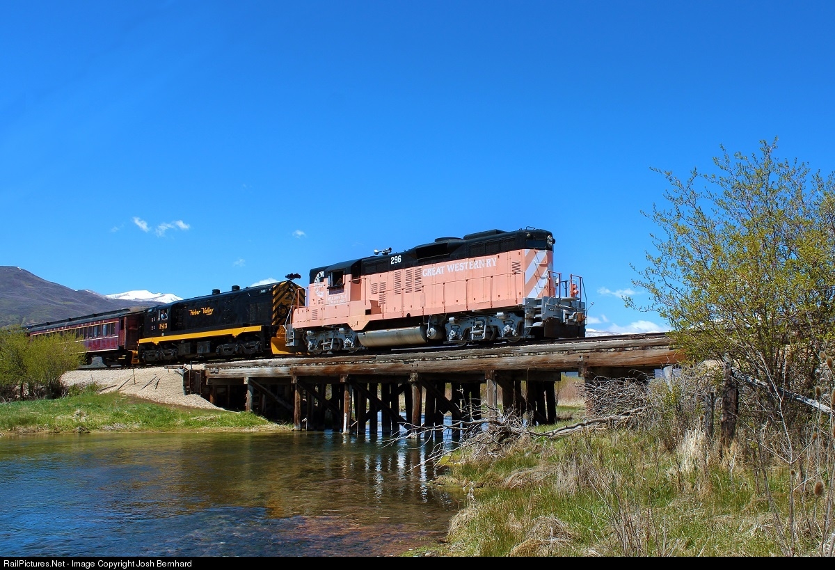 Great Western 296 was purchased by the Heber Valley Railroad from a museum in Boulder Colorado and after a thorough mechanical rebuild was tested on a revenue passenger train longside one of their MRS-1s. The GW painted it orange, which faded to an odd color giving it the nickname "Pink Bunny" among some Heber locals.