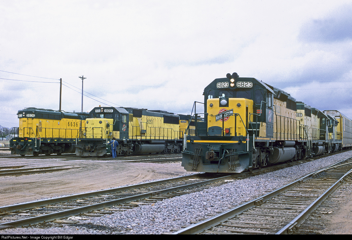 CNW 6823 is on the head end of PREMA, Proviso-East Minneapolis manifest, along with a Zito yellow GP40 and SD18. It sports CNW's final color scheme. To the left, SD60 8051 and SD18 6636 are being readied for their chores. The various yellow shades bring some sunshine to a gloomy morning at Altoona, WI.