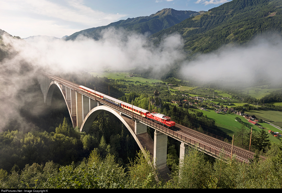 | EBFL's special speeds trough some clouds at Falkenstein viaduct. It was bound from Lienz to Zell am See doing a one day trip. 1020 018 is the pride of Eisenbahn Freunde Lienz organization, restored to original ÖBB state. |