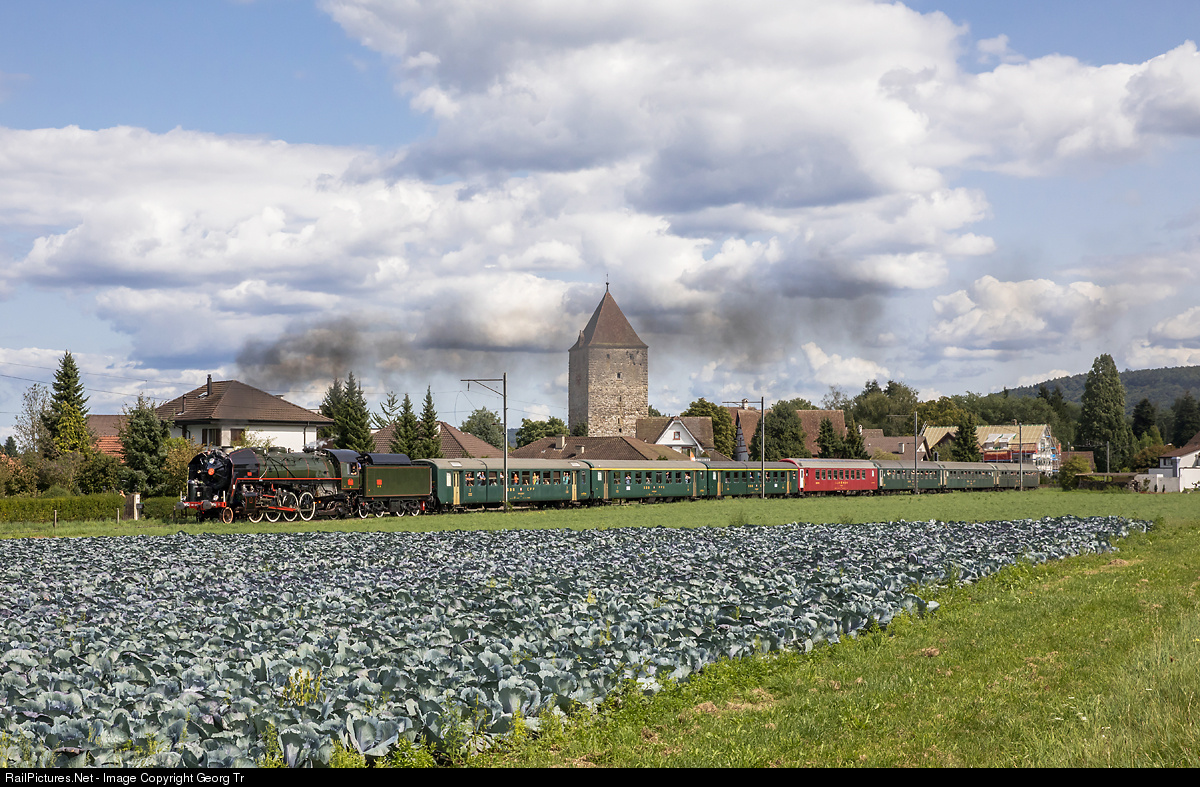 On the occasion of the "Badenfahrt", a large fair which is held every 10 years, the canadian built, former french railways SNCF, "Mikado" steamlocomotive 141 R # 1244, made 3 round trips "round the Lägern", from Baden via Regensdorf-Zürich Seebach-Bülach-Eglisau-Koblenz-Turgi to Baden. On the second sunday trip the train just left the water stop of Weiach-Kaiserstuhl. The first two cars are from association Mikado 1244, the others from "Club 22-70", all are former SBB cars. The upper tower (Oberer Turm) in the background dates from the 13th century.