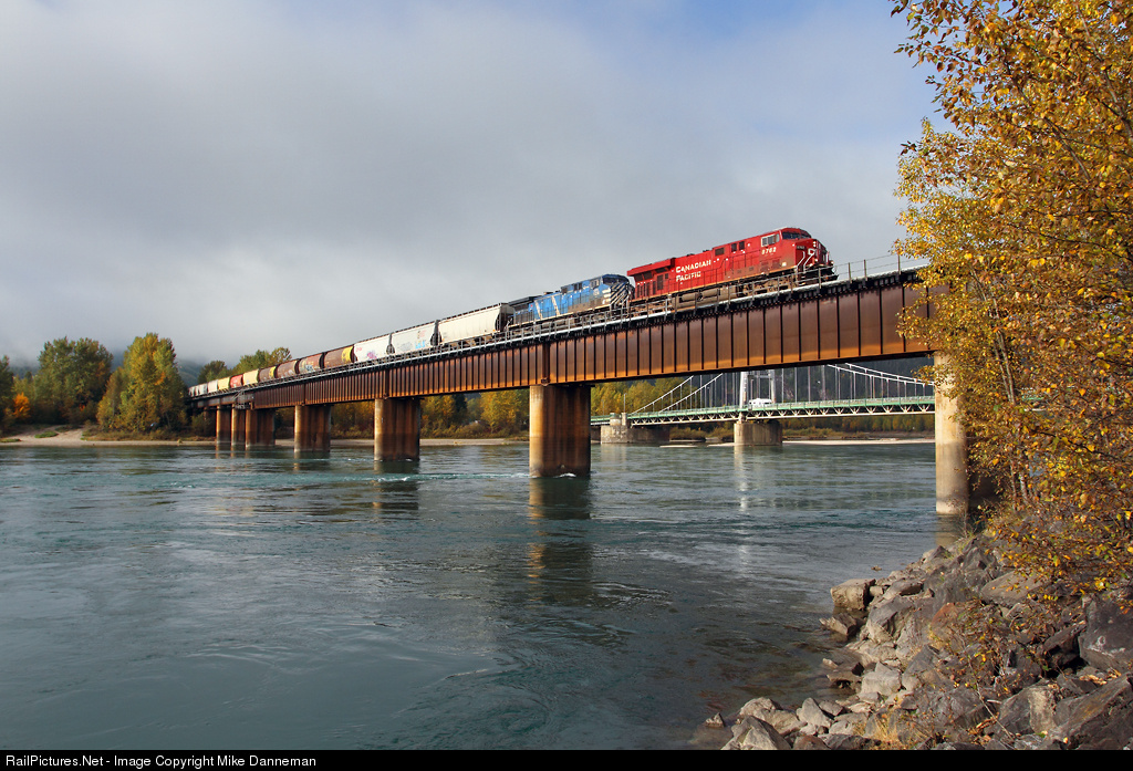 | Canadian Pacific train No. 302 crosses the Columbia River entering Revelstoke, British Columbia, on the morning of September 30, 2015. |