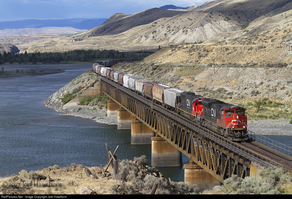A westbound grain train crosses over the Thompson River at MP 59.5, running on a directional section of the Ashcroft Subdivision at Basque, BC