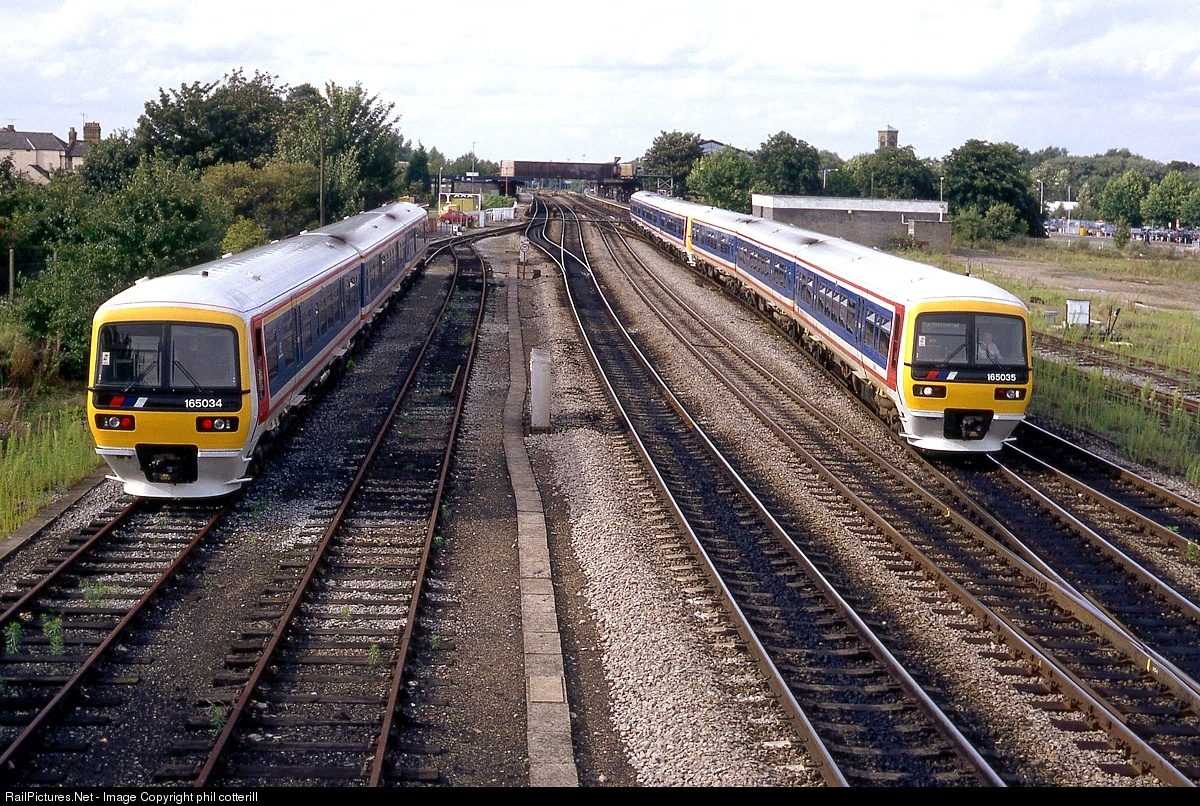 | Hard to believe that these units are now 25 years old. Here, 165035 leaves Oxford for London Paddington in 1992. A sister "Turbo" unit is stabled in the sidings on the left.