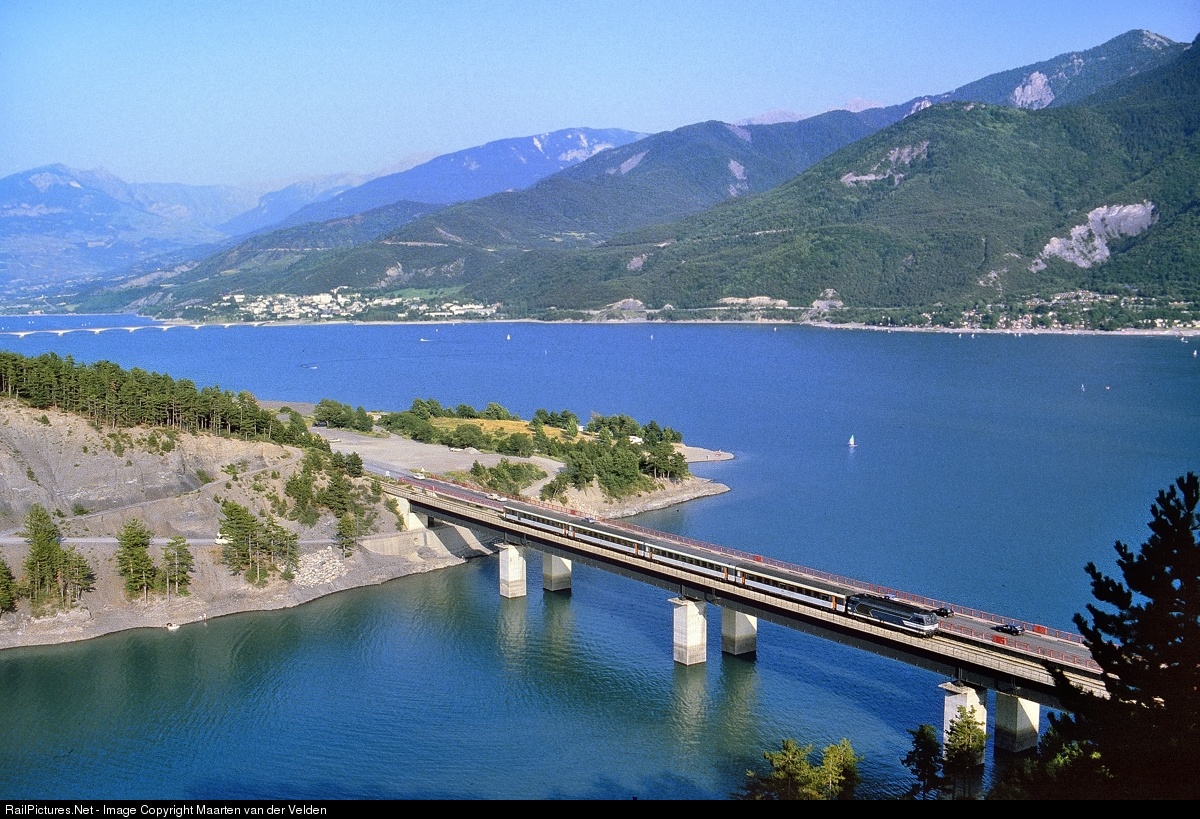 | Train E 5388/9 from Briançon to Marseille-St-Charles is crossing a branch of the Lac de Serre-Ponçon. The train is hauled by a BB 67400.