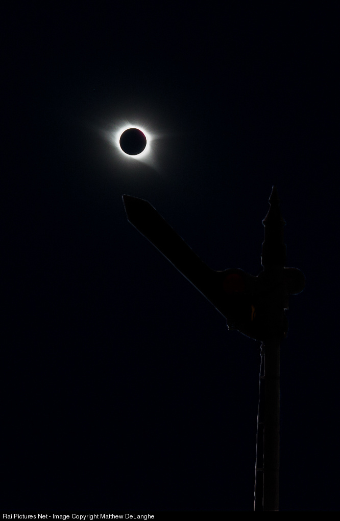 A fixed semaphore stands tall in the faint glow of the 2017 eclipse in totality.