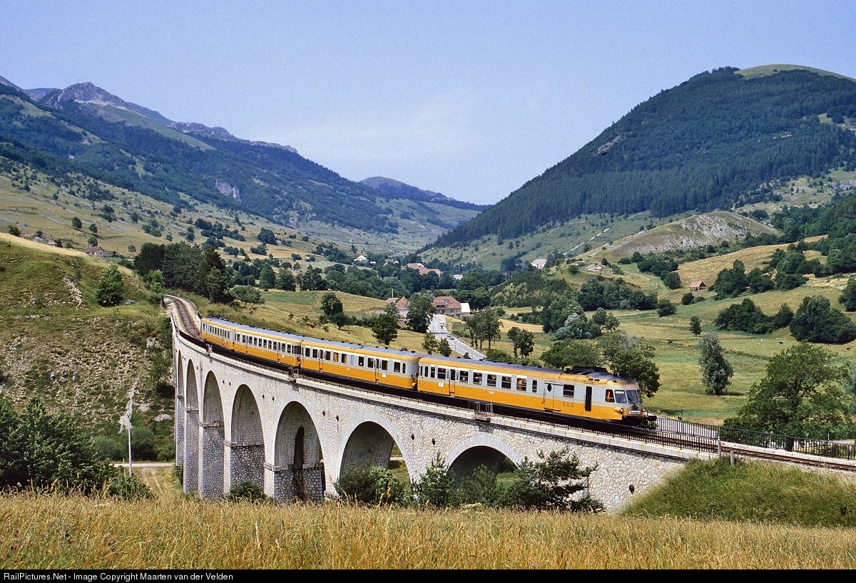 | Two by the time not refubished RGP's (Rame à Grande Parcours) are crossing the Viaduc-des-Lusettes as train E 5397/6 "Alpazur" from Grenoble to Digne and Marseille-St-Charles.
