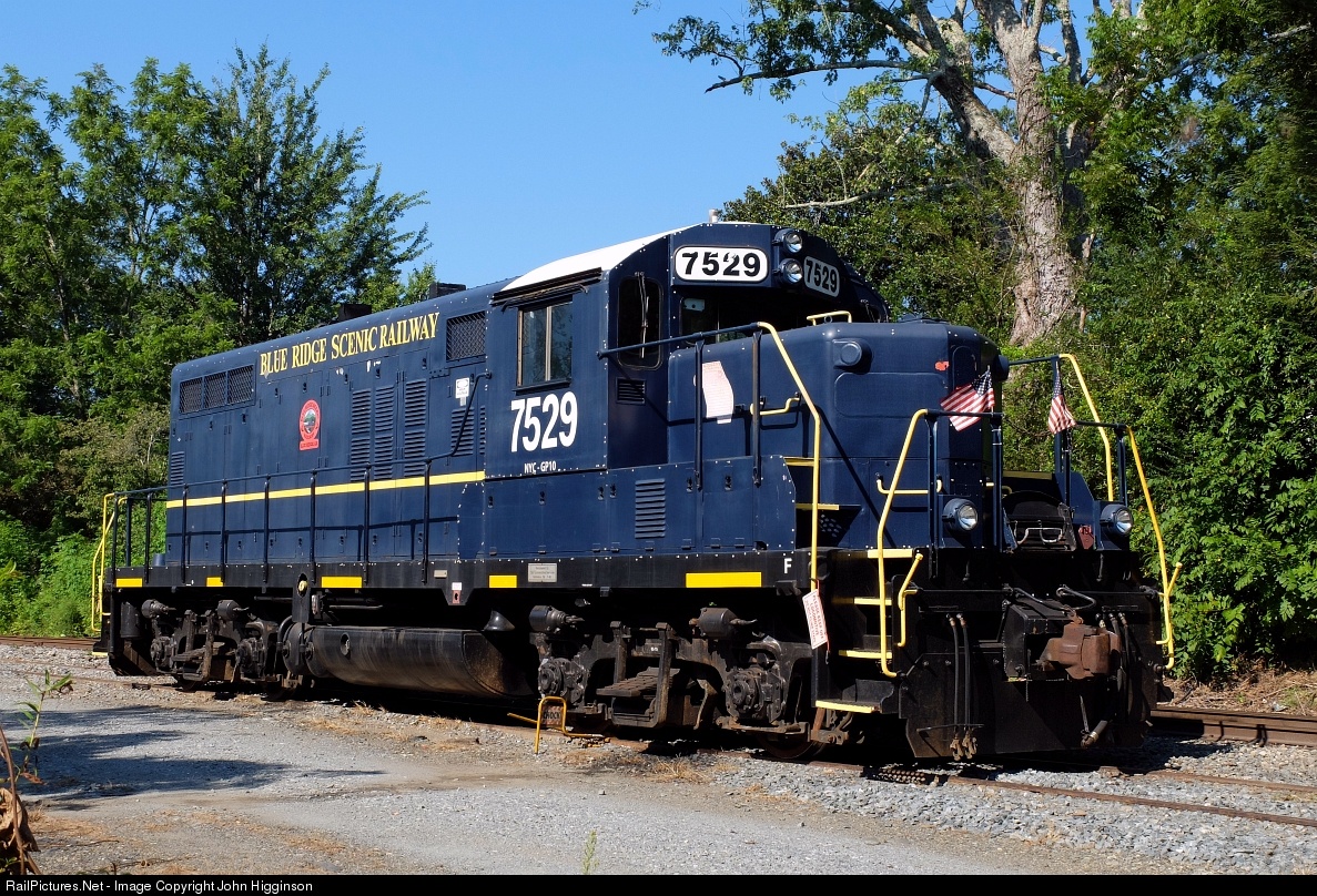 Georgia Northeastern GP10 7529, a rebuilt former NYC GP9, rests near downtown Blue Ridge on a Sunday morning. This is one of two GNRR locomotives painted for the Blue Ridge Scenic operation, although it is not unusual for the excursion train to be powered by any locomotive from the GNRR freight pool (as it was the day of this photo). The Blue Ridge Scenic operates excursions along the Toccoa River on the former L&N “Hook and Eye” line between Blue Ridge and McCaysville, GA.