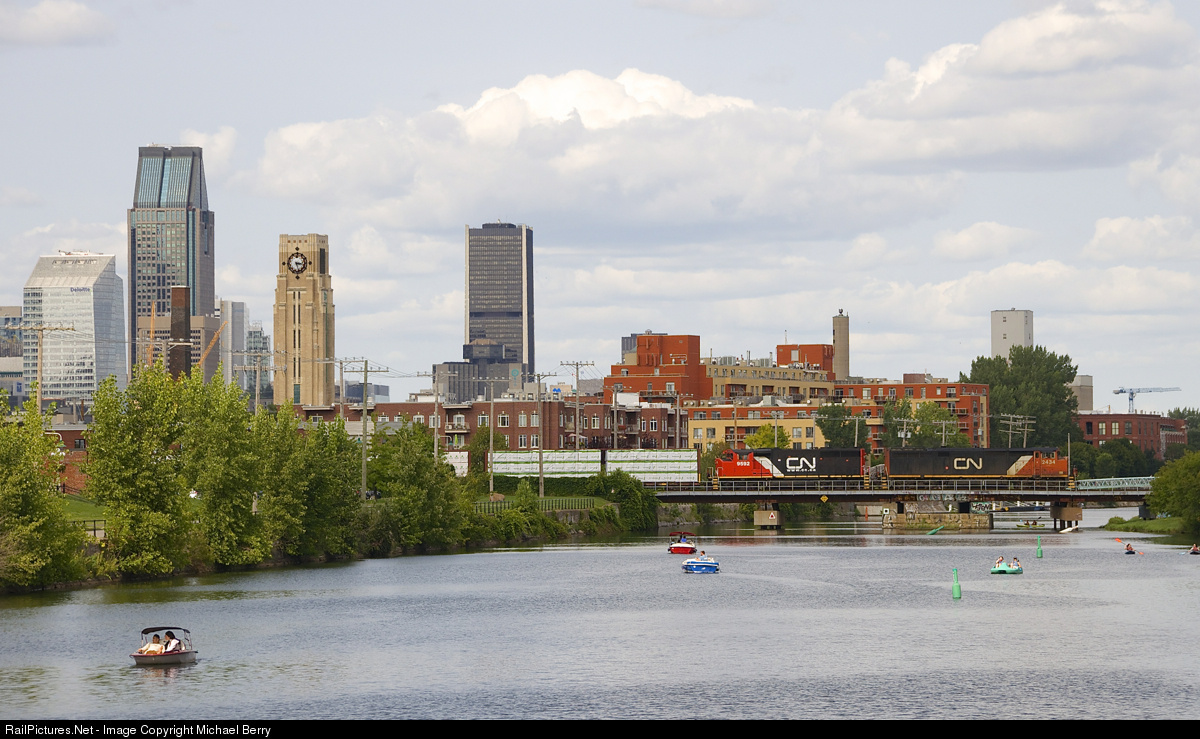 CN 324 with CN 2434 and very clean CN 9592 crosses the Lachine Canal, with part of Montreal's downtown skyline visible in the background.