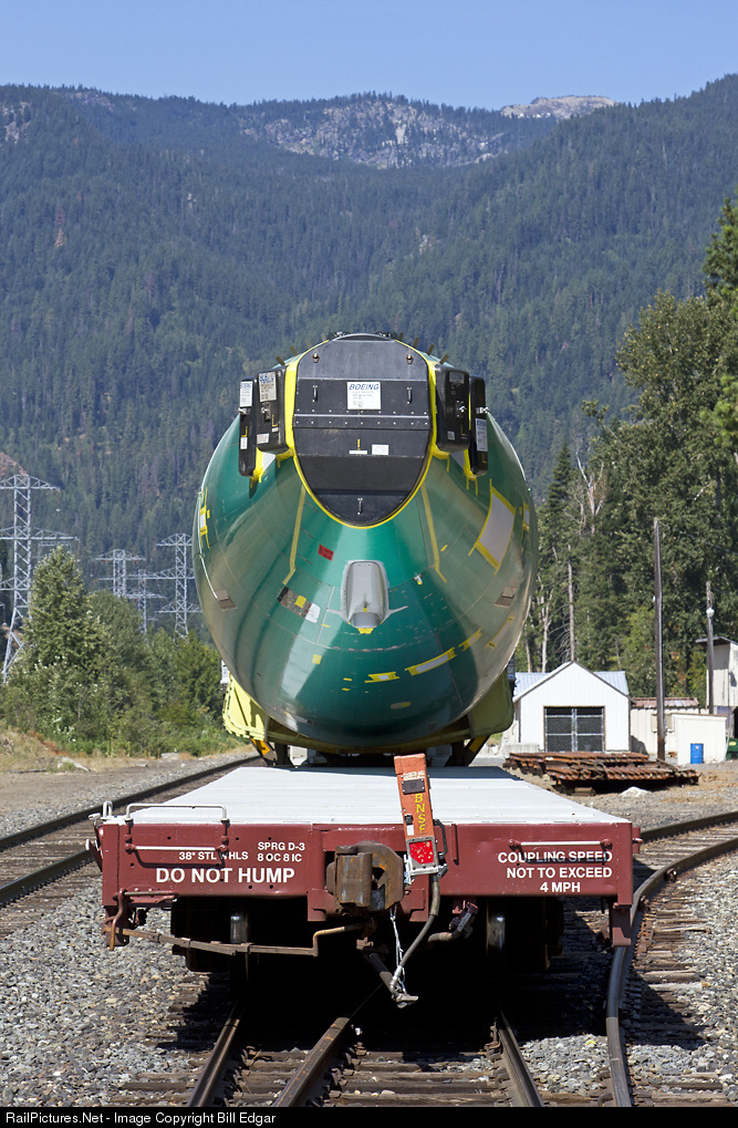 | With BNSF 8066 on the front, here is what the tail end of a Boeing 737 looks like on the rear of a four car J-train carrying two fuselages at Merritt, WA. I will reserve any further commentary. |