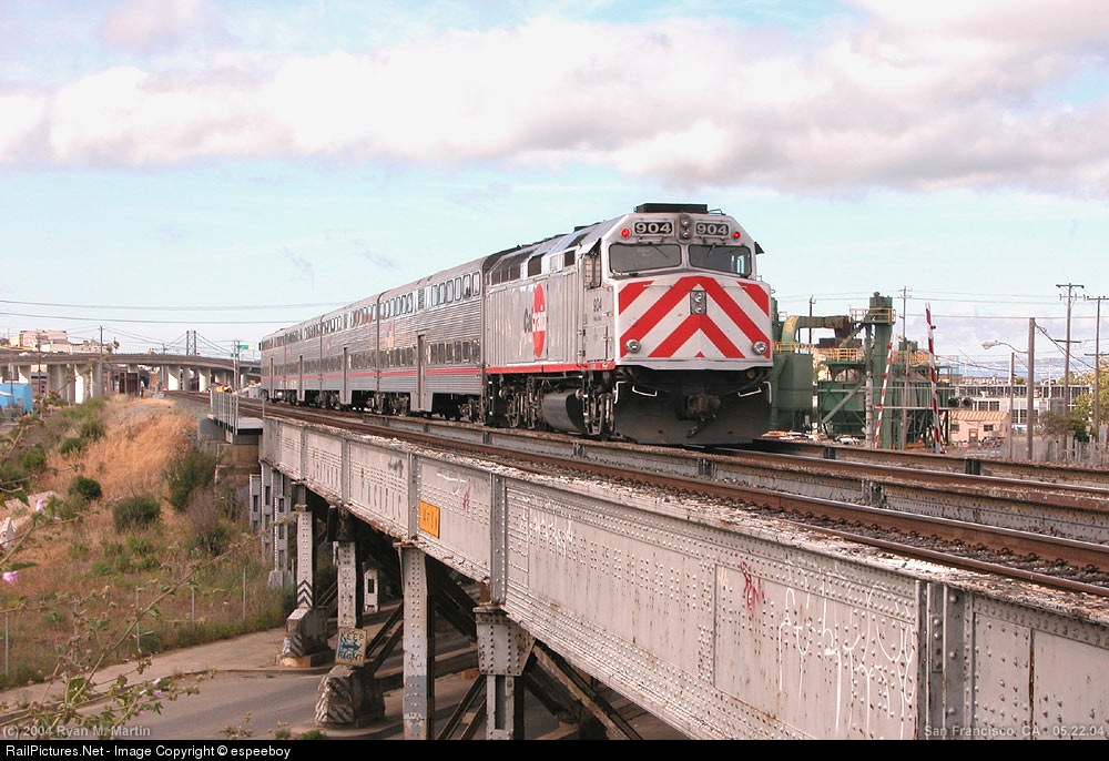 | Last test train of the day gives us an F40PH pushing a gallery car consist into S.F.. Note that the Bombardier cars are not on these test trains. Reports have it that they are all being retofitted for the "Baby Bullet" service. |