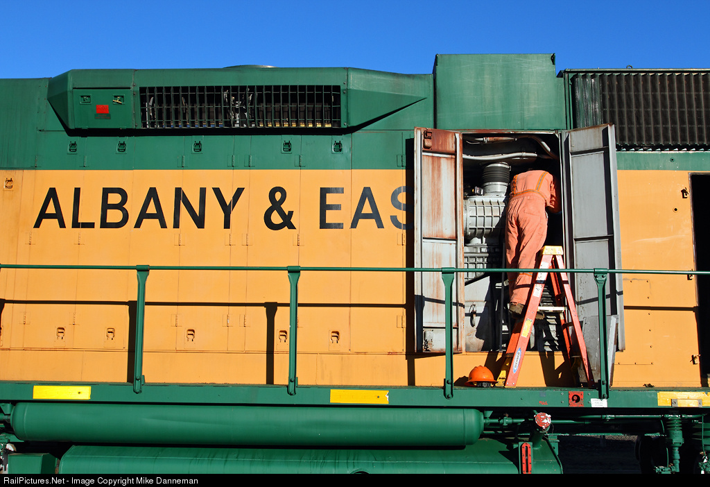 Albany & Eastern EMD GP38AC No. 2001 gets some mechanical attention from a shop employee at the railroad’s locomotive facility at Lebanon, Oregon, on the morning of September 26, 2016.