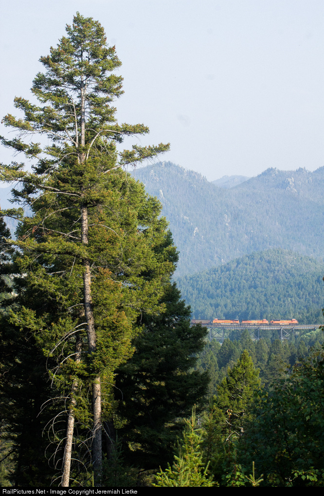| A BNSF coal train makes it way over Skyline Trestle through what appears to be a sea of green adjacent to the Continental Divide. The haze featured in this photo is most likely thanks to a fire that sparked south of Helena just a few days earlier. |