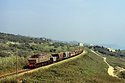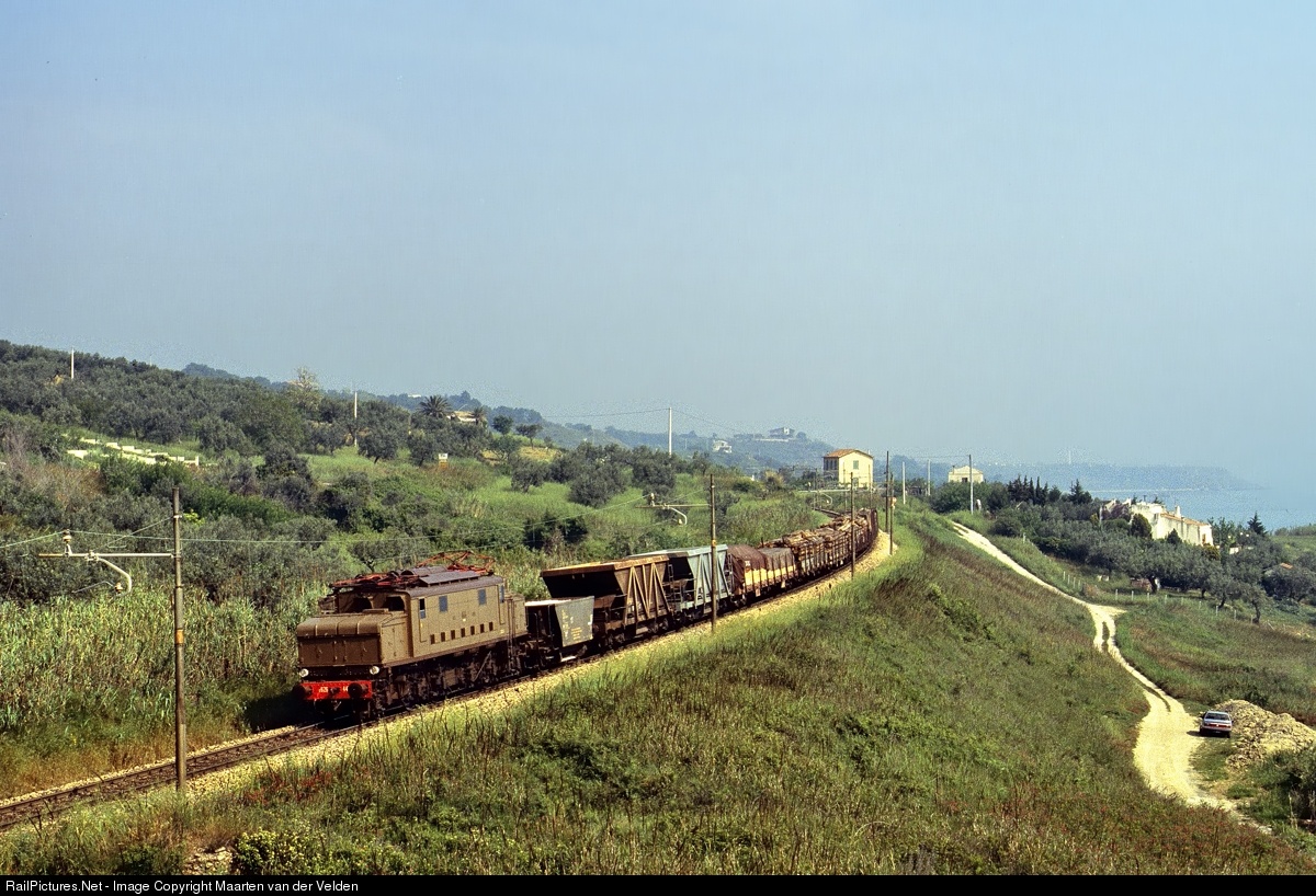 | A southbound freight hauled by a FS E.626 locomotive on the line alongside the Adriatic Sea. The stituation on this spot is totally changed. No trains are running here anymore. There is build a new double track railway line what is going through a long straight tunnel.