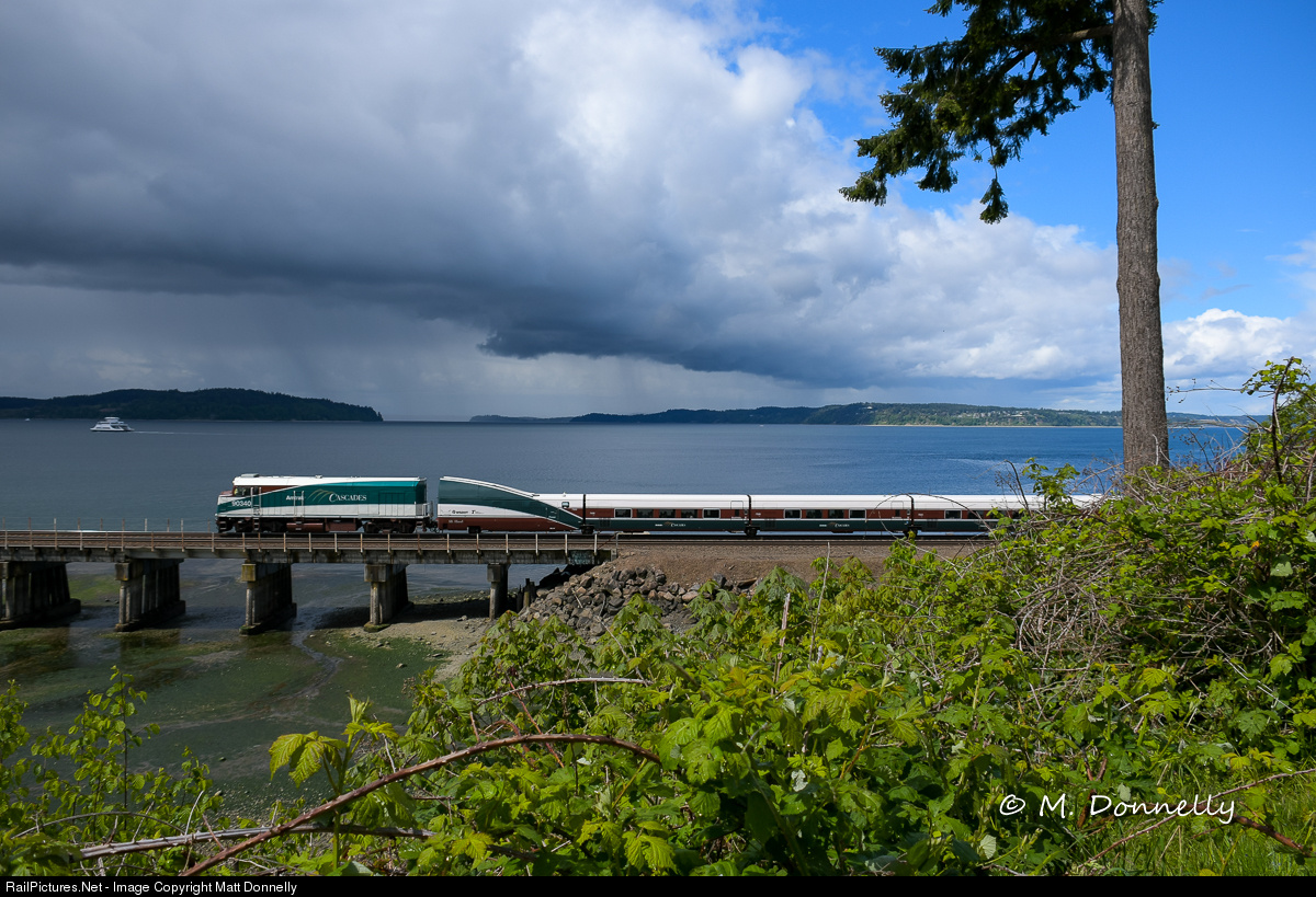Amtrak Cascades heads past a small cove of the Puget Sound at scenic Stielacoom as a storm front passes in the background.