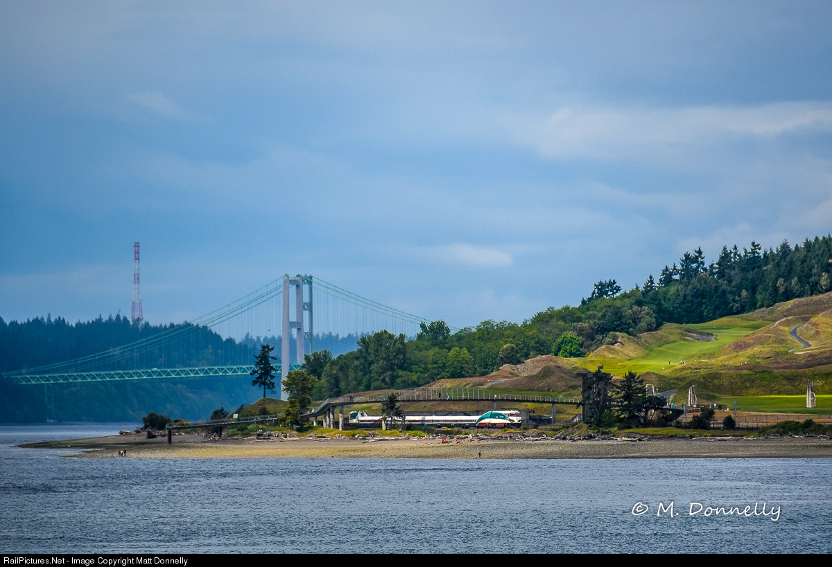 | Amtrak Cascades passes the scenic Chamber Bay golf course, and the two spans of the Tacoma Narrows Bridge can be seen in the distance. |