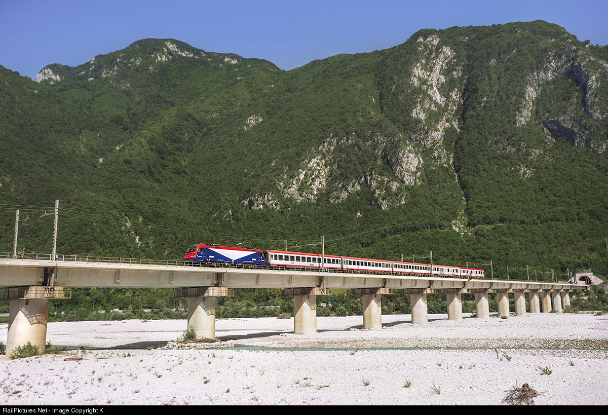 Taken into service in 2000; the new Pontebbana (or Pontafelbahn is german) is a 90km long double track line trough some miles long tunnels, with a maximum speed 180km/h. Starting at the Austro-Italian border, Tarvisio-Boscoverde the trains descend into the hills and run there in tunnels with the exception of two surface stations 40 miles until Carnia (You can see the last tunnel's gate at the far right), heading more towards Udine come the viaducts over the river Fella. On the photo: REX 1821 from Villach to Udine crosses Pontebbana-e-Fella viaduct and slows for it's stop at Carnia station to pick up the bikers and hikers. This service was introduces specificly for bikers, because the old railway line was converted into 'Alpen-Adria bikeway' and these two pair of Regional expresses are taking the people up to the top from both countries to Tarvisio/ Ugovizza/ Pontebba so they can roll down as long as they like. Coaches are from ÖBB, Lok from FUC, an italian privateer.