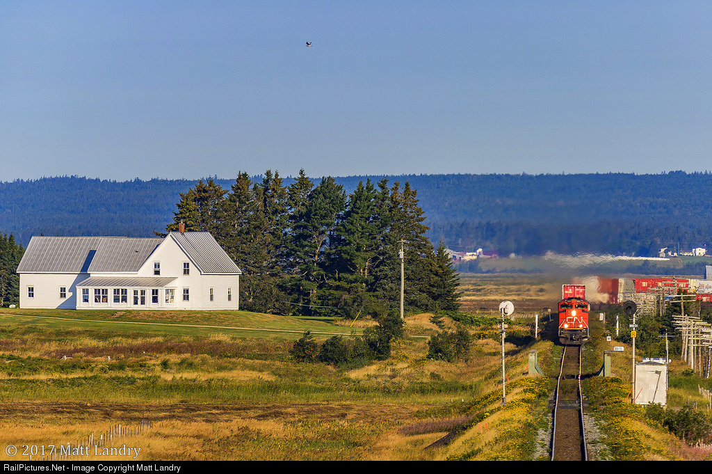 CN 8880 leads eastbound stack train Q120, as they approach the New Brunswick/Nova Scotia border.