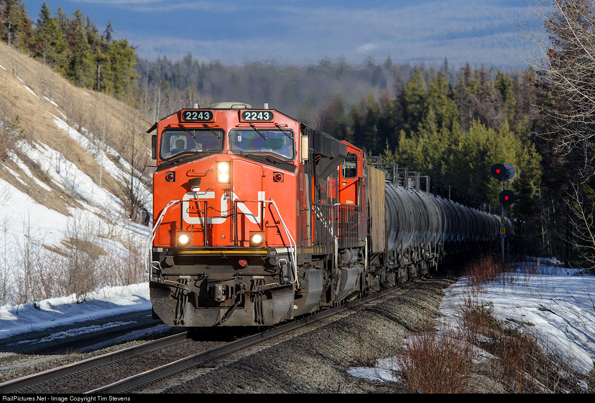 | CN ES44DC 2243 leads the first unit crude oil train from the Grande Prairie region west on the Albreda Sub. The cars originated at Secure Energy's Rycroft, AB terminal and were destined for Tacoma, WA. |
