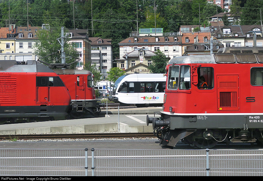| Rush hour: The two locs on the left side are running toward St. Gallen Main Station, the red one on the right side is ready for departure. The white passenger train is waiting for the next trip |