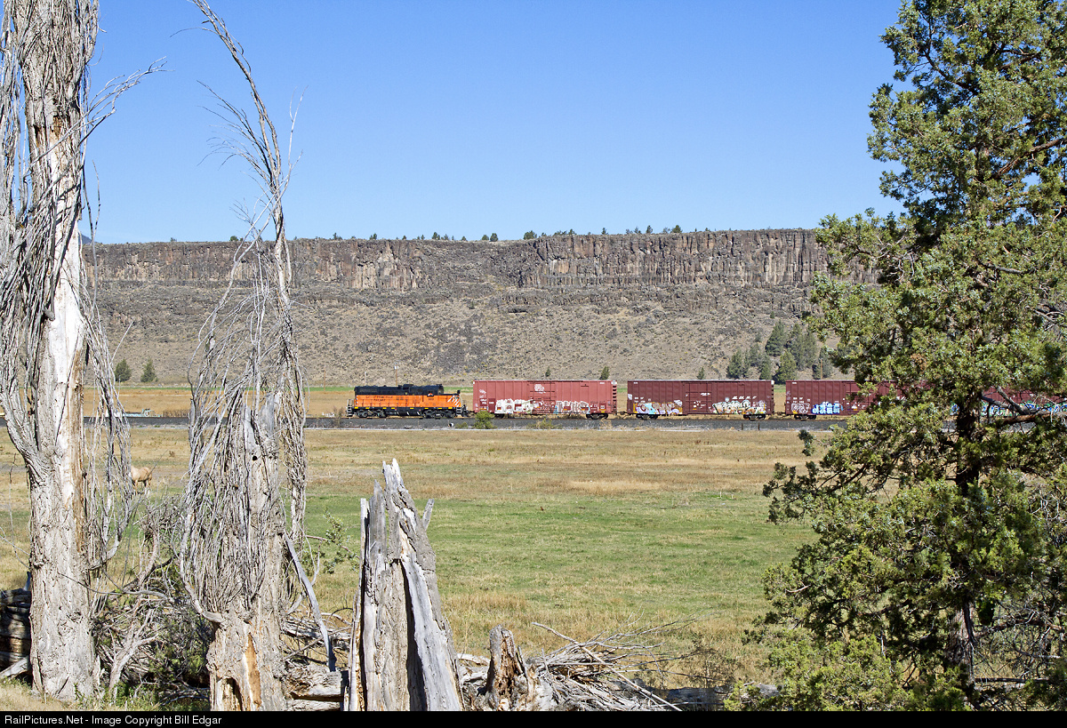 | COP 989 rolls west toward Redmond, OR with a local turn that originated in Prineville. It will interchange cars with BNSF and head back to Prineville and do some switching. The loco is a former MILW GP20, rebuilt in the late 1960s from GP9s. |