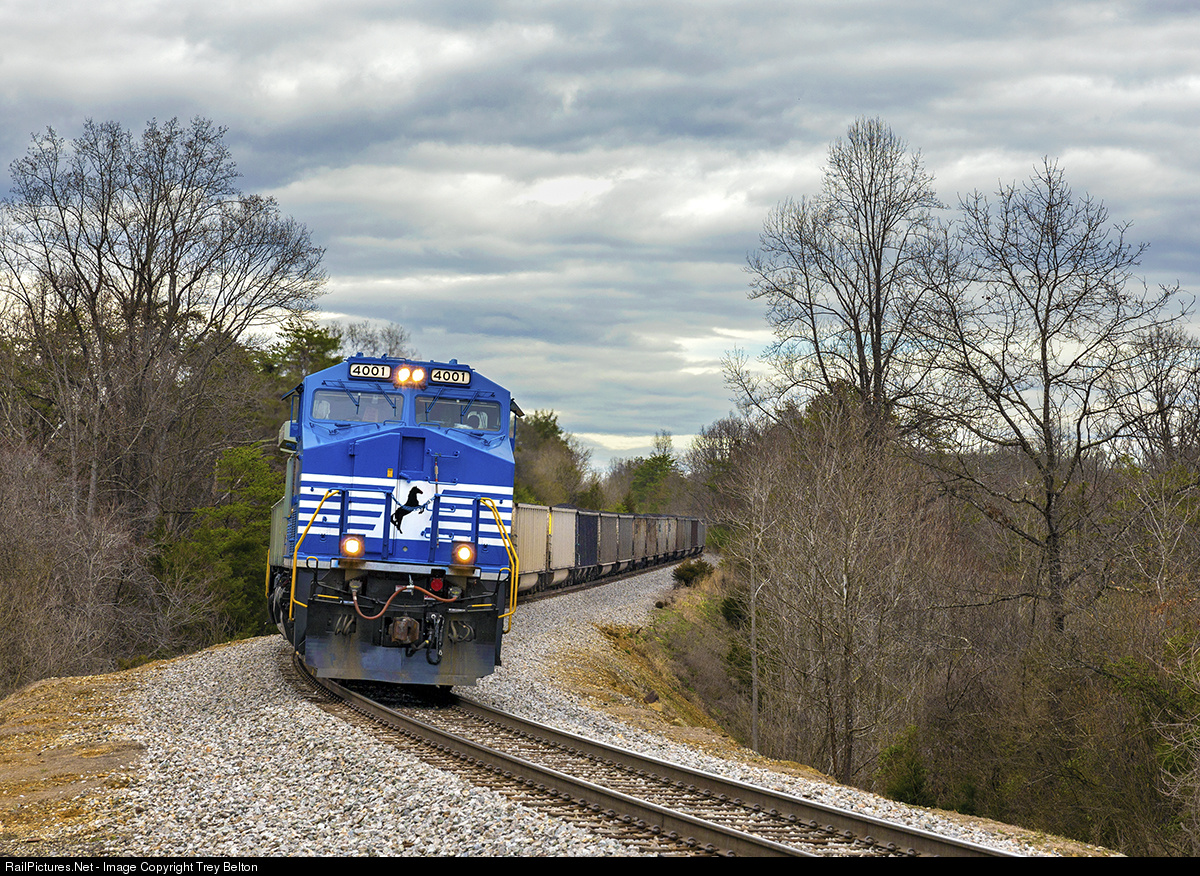 | The NS 4001 DC to AC unit along with its twin, the NS 4000, lead the NS 756 south at Rocky Mount. |