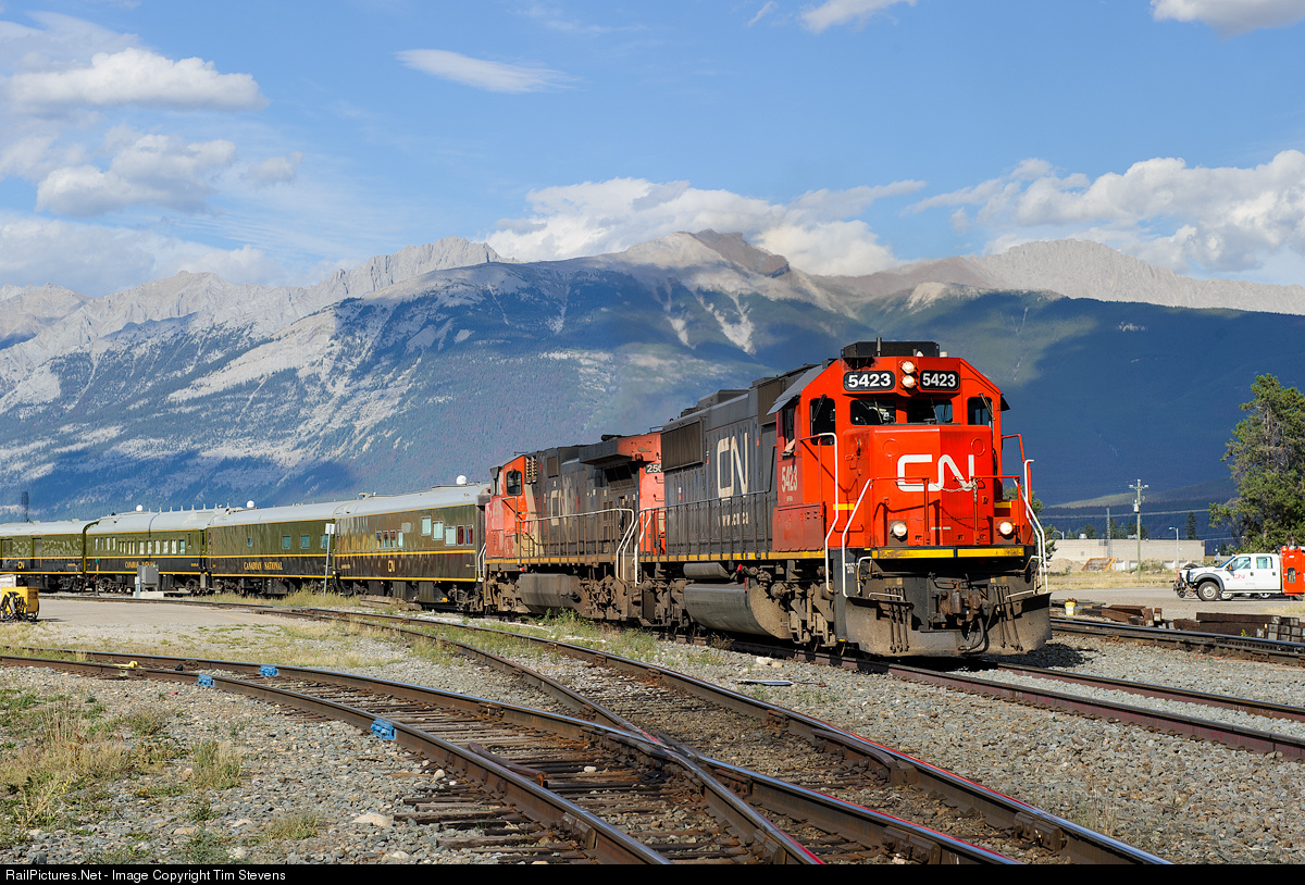 | CN SD60 5423 departs Jasper with Q191's train. On the headend were four CN business cars painted in the classic green and gold scheme. They were presumably on their way to Prince Rupert to celebrate the 10th anniversary of the Fairview Intermodal Terminal. |