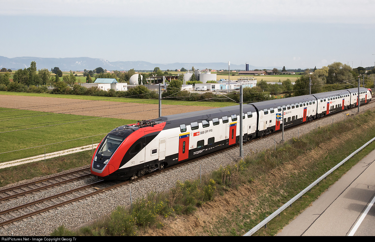 | Long distance test run across Switzerland from St.Gallen freight yard to Geneva Airport, via Winterthur-Zürich Airport-Zürich main station underground tracks-Heitersberg-Olten-NBS-Bern-Fribourg-Lausanne-Geneva. The IR100 "Twindexx Swiss Expres" from Bombardier for the SBB, RABe 502 # 404 is racing over the NBS near Hindelbank with 200 km/h. |