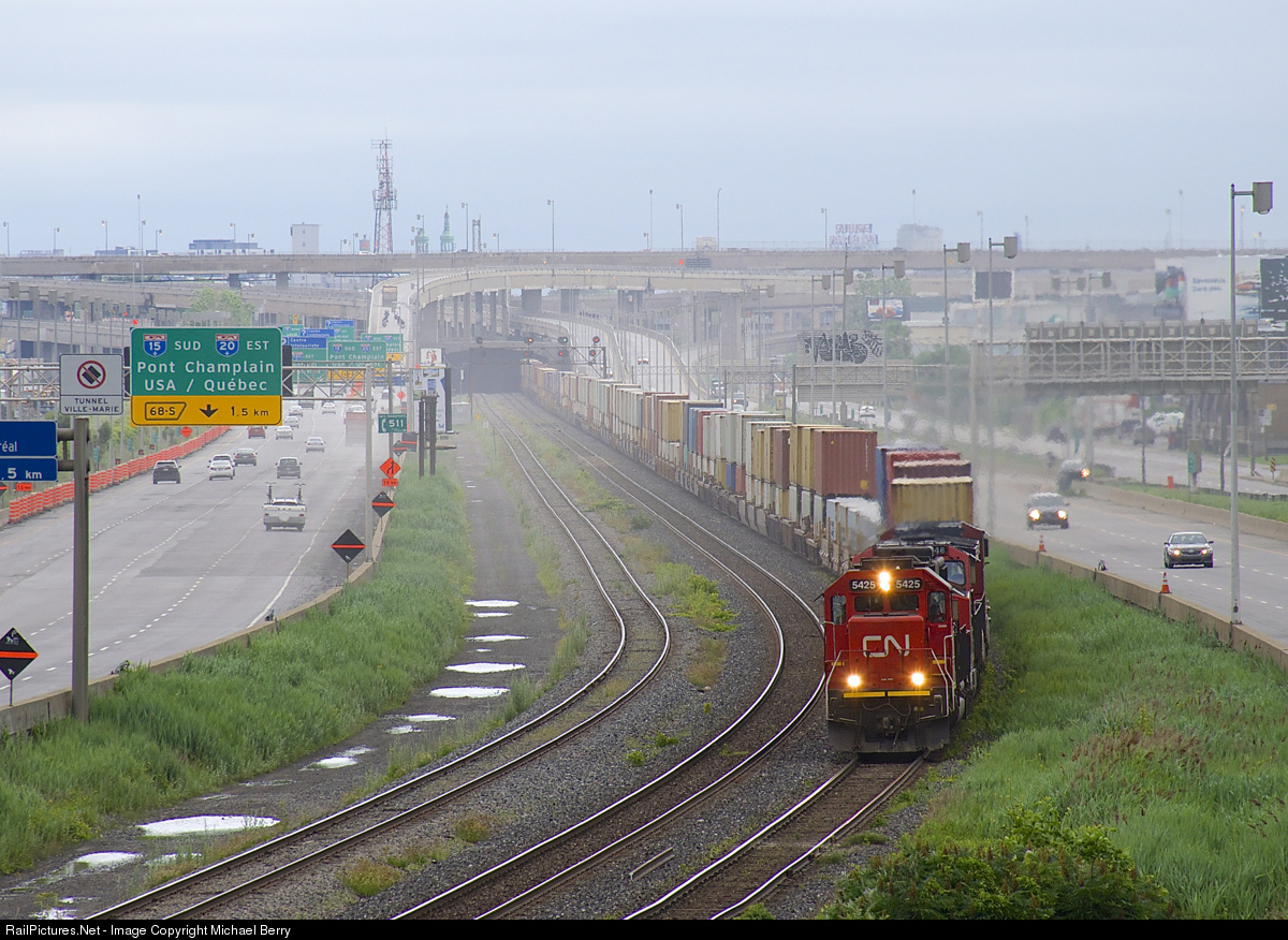 | CN 149 has an ex-Oakway SD60 leading two Dash9's (CN 5425, CN 2546, IC 2701) and 586 axles as it approaches Turcot West in Montreal. |