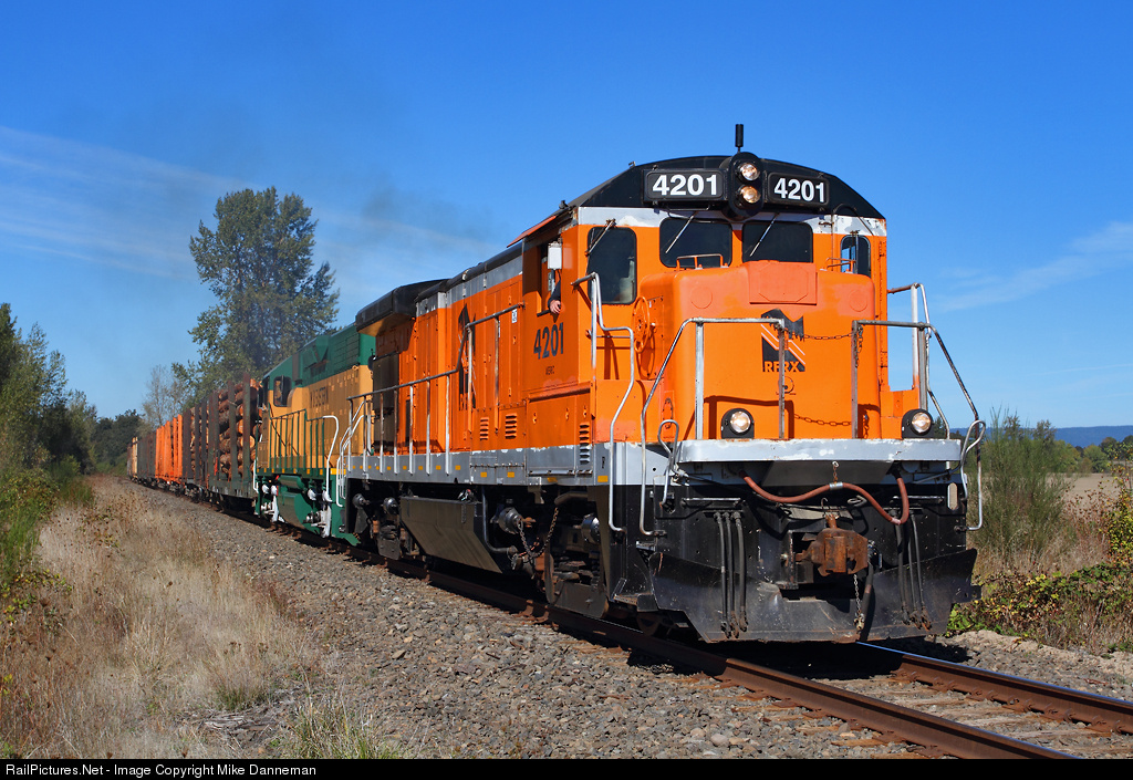 Passing milepost 693, an Albany and Eastern log train is about to cross Lacomb Dr. north of Lebanon, Oregon, on September 27, 2016. The train is returning from the Teevin Bros. log yard and reload facility at Crabtree, and is led by AERC GE B23-7 No. 4201, which is former Conrail No. 1904, a well-traveled locomotive that also spent time on Metro-North, BNSF, Ohio Central and Port of Tillamook Bay Railroad. The RFRX markings are Rick Franklin Corporation (owners of AERC), but note that the locomotive now has small AERC reporting marks below the road number on the cab sides. The locomotive left the AERC roster in 2017.