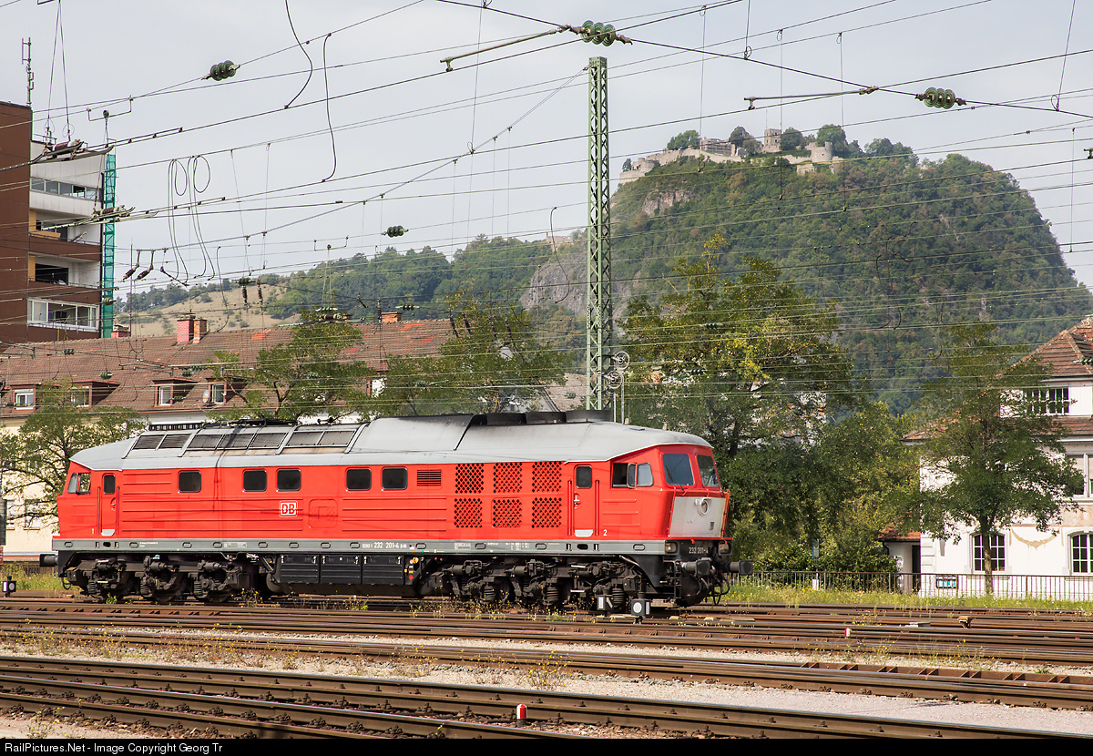 | 3000 HP diesellocomotive "Ludmilla" 232 # 201 of DB Cargo in Singen. The locomotive arrived with a mixed freight from Friedrichshafen-Radolfzell, a diverted train because of the Rastatt interrupt. Built in 1975 by Woroschilowgrad Locomotive works in the former USSR for the Deutsche Reichsbahn (DR) of the GDR as V 132 # 201. In the background the Hohentwiel, a dead volcano, with a castle on top. |