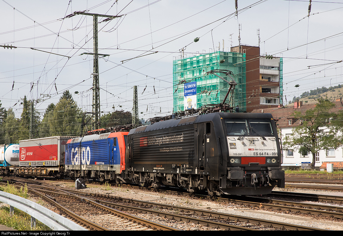 | Es 64 F4 # 091 of MRCE (leased by SBB Cargo International) and Re 474 # 015 of SBB (same type) in multiple are entering Singen from Schaffhausen with a diverted freight train because of the line interruption near Rastatt. |