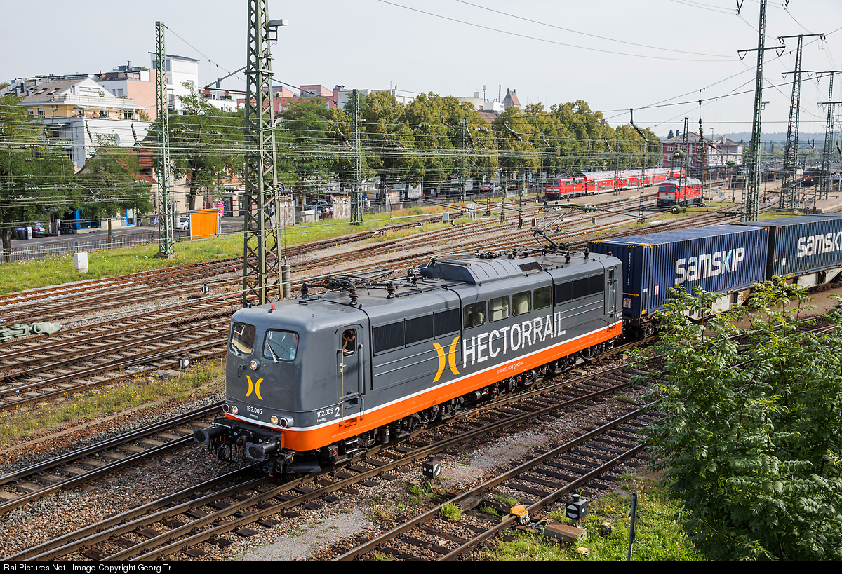| 162 # 005 "Herzog" of Hectorrail (the former 151 # 133 of the DB, built in 1976) is leaving Singen with a diverted SAMSKIP container train to the north. |