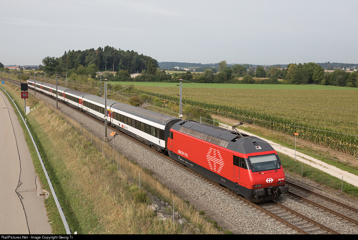 Re 460 # 027, one of the 10 locomotives which got a "R3" rebuilding at Yverdon already, is shoving the Interregio 2514 Lucerne-Berne-Geneva Airport with 200 km/h over the NBS near Hindelbank. The 45 kilometer long "highspeed line" NBS from Mattstetten (Aespli) to Rothrist was opened in december 2004, to shorten the curvy line via Burgdorf-Herzogenbuchsee-Langenthal. Usually, every half an hour, three trains are following each other with an interval of about 2 minutes, controlled by ETCS (European Train Control System, no optic signals along the line). But sometimes, there are even shorter distances between trains, the shortest which I recorded this day was 89 seconds only, which means a distance of less then 5 kilometer between the two trains, each running with 200 km/h. The engineer of the train hasn't to obey the 100 km/h speed limit, which is signaled on the parallel highway A1....
