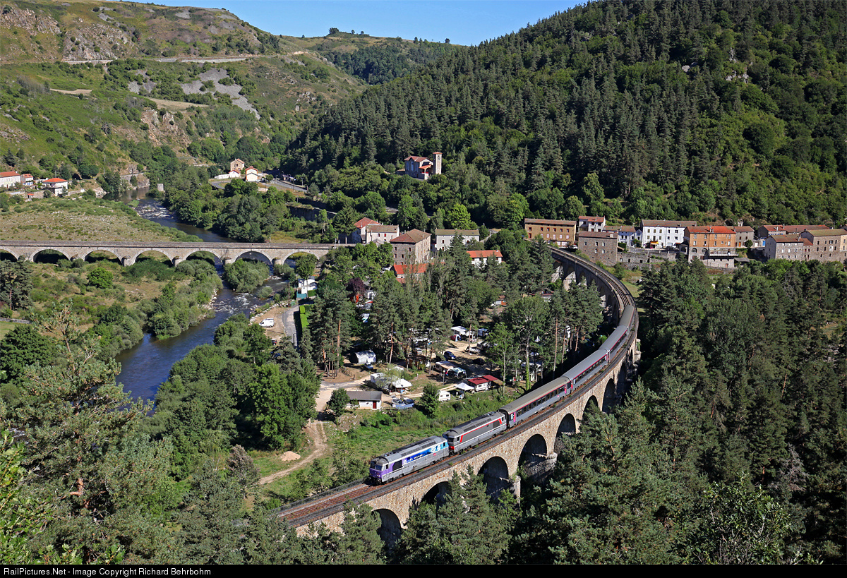 Two BB 67400 are crossing the viaduct of Chapeauroux with Intercity Nîmes - Clermont-Ferrand.