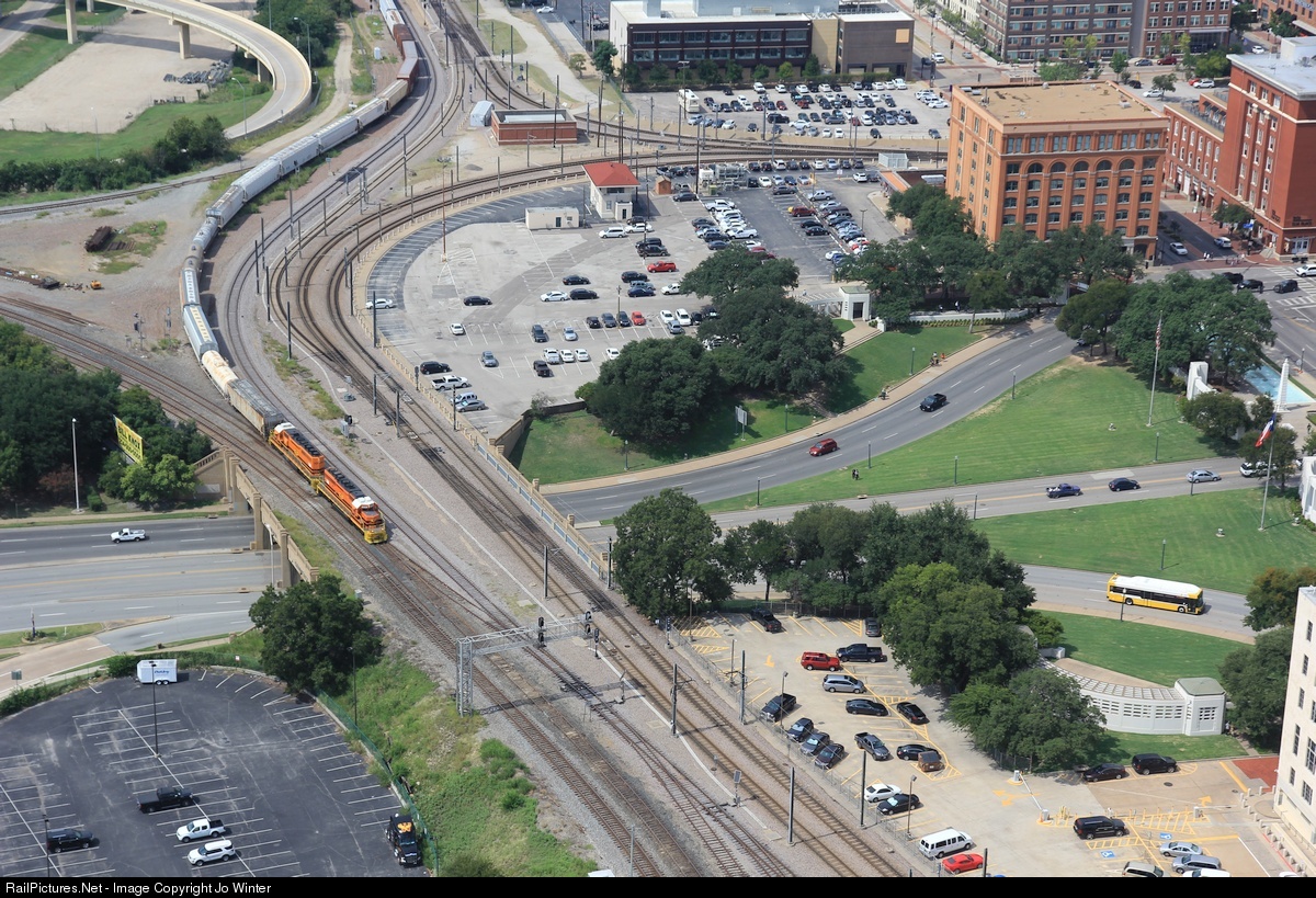 A Dallas, Garland & Northeastern manifest freight train slowly approaches Dallas Union Station. Also shown is Dealey Plaza where President John J. Kennedy was assassinated on November 22, 1963. The shots were fired from the brick building in the top right corner of the picture (then, the Texas School Book Depository). Photo taken from Reunion Tower, some 500ft above.