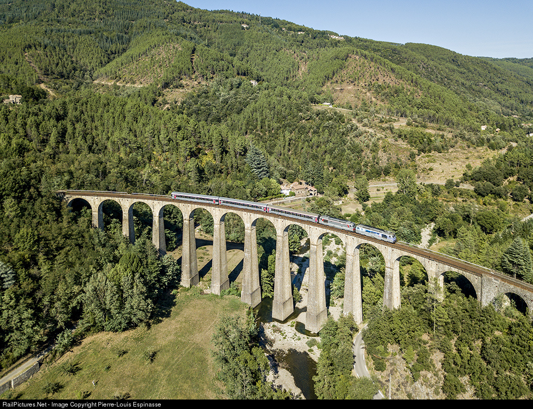 | Intercity linking Clermont-Ferrand to Nîmes is crossing the Chamborigaud viaduct over the Luech valley. |