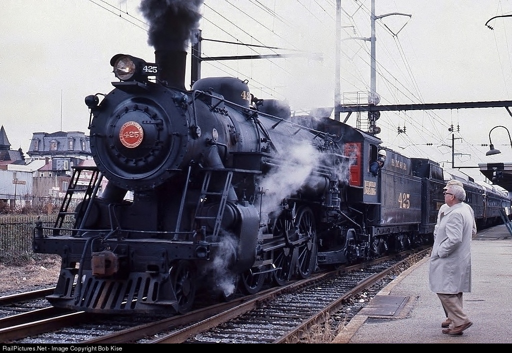 | Regular SEPTA R6 commuters are awed by the 425 bringing in a load of shoppers from South Hamburg on a Friday-after-Thanksgiving excursion. Note the Blue Mountain & Reading's RDC cars being used as coaches, behind the 425's auxiliary tender. |
