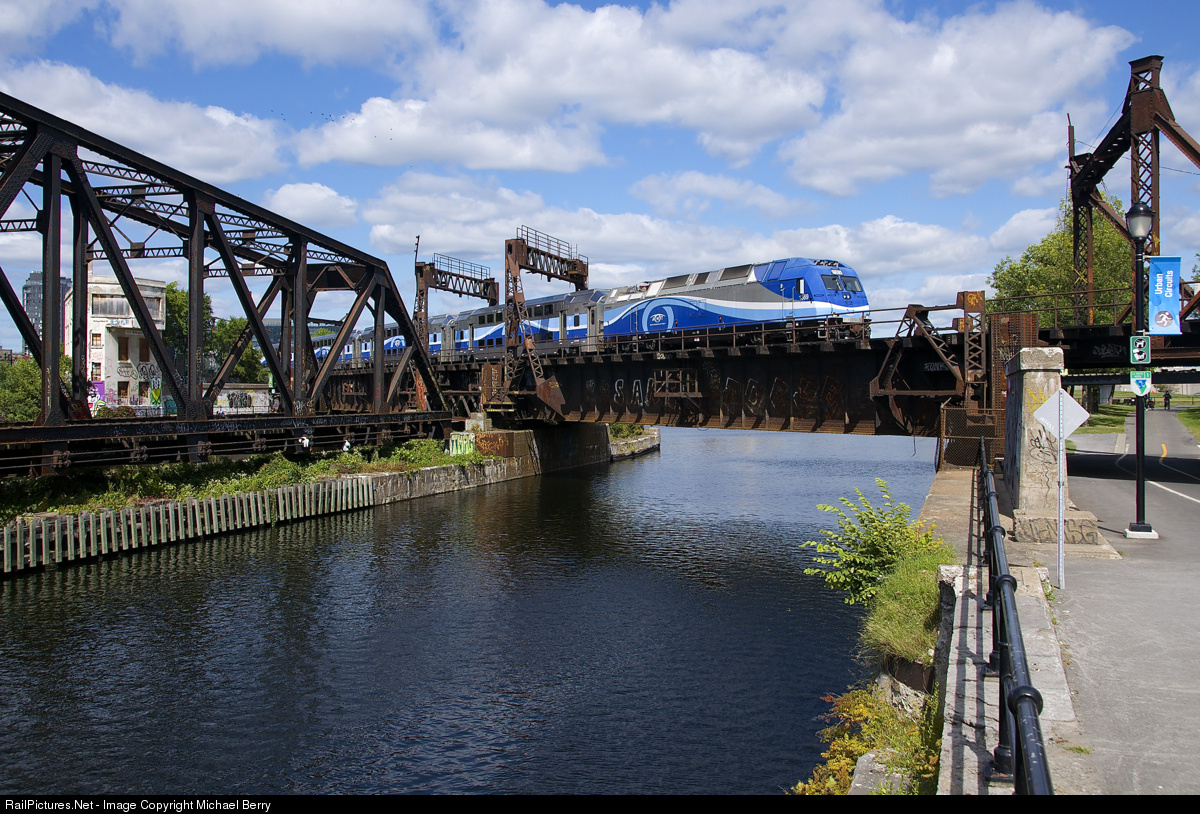 AMT 1369 pushes the mid-day train on the Mont-St-Hilaire line over the Lachine Canal.